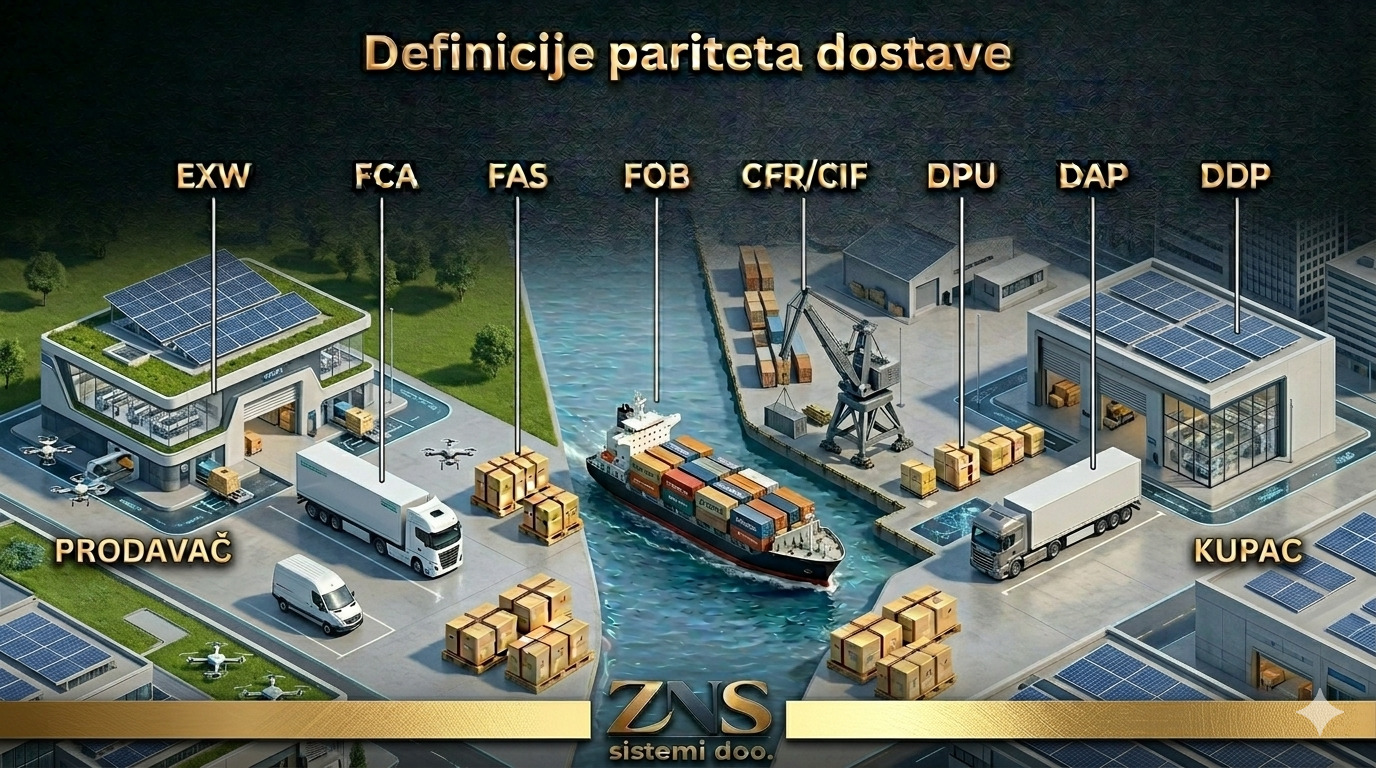 Prodavatelj snosi sve troškove i rizike – izvoz, prijevoz, osiguranje, carinjenje u EU, PDV i dostavu do kupca. Kupac samo preuzima robu.